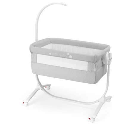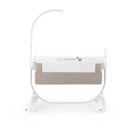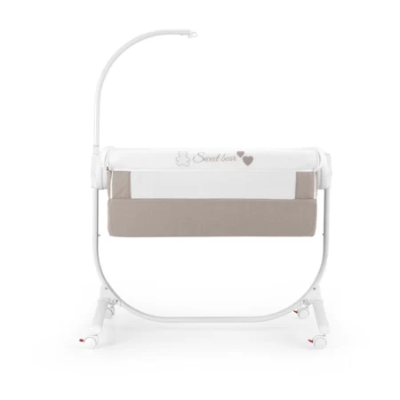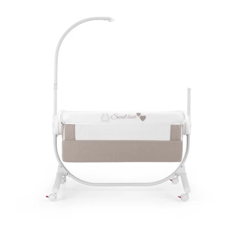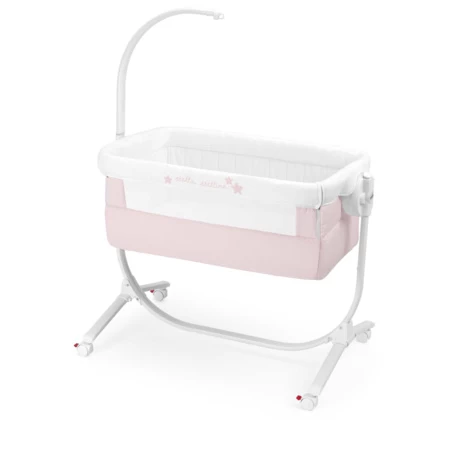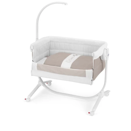 8 hauteurs, ouverture barrière avant pour fonction co-sleeping, position anti régurgitation, mouvement horizontal du berceau (excursion jusqu’à 16 cm) pour compatibilité avec tous les types de lits, fonction bascule, 4 roues multidirectionnelles dont 2 avec frein, sangles pour la fixation au lit.