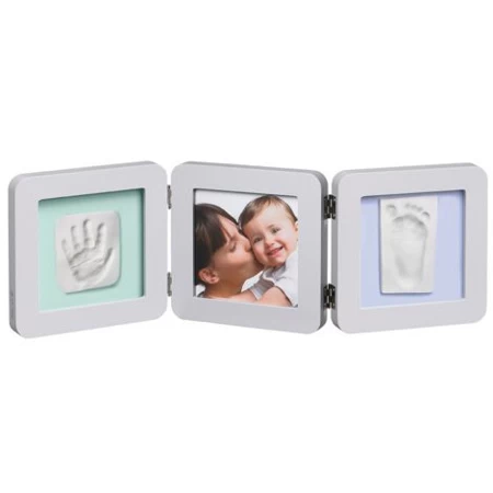 Baby Art : joli cadre décoratif 3 volets incluant une photo et deux empreintes précises de la main et du pied de bébé, permet de creér avec votre enfant un souvenir personnalisé qui restera pour toujours un moment unique.