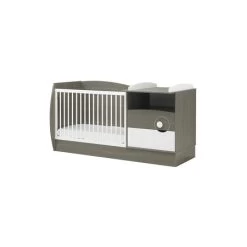 Ce lit compact est doté d’un sommier à lattes 60×120 cm réglable sur 2 positions, d’une barrière fixe une position, d’un plan à langer inclus, de deux tiroirs, d’une niche et d’un plan de transformation pour lit junior.
