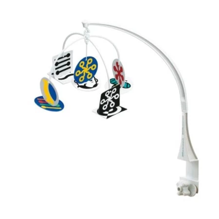 Allongé sur le dos dans son lit ou sur son transat, l’enfant regarde attentivement les couleurs vives et les dessins en noir et blanc de ce mobile Wimmer Ferguson.