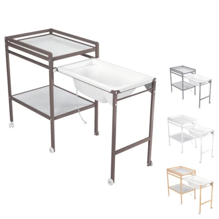 Description : En bois de hêtre, avec 6 roulettes dont 2 avec frein. Étagère de rangement et barreau porte-serviette. Coulissante : la baignoire amovible se glisse sous la table à langer avec un système de verrouillage exclusif. Dim en position bain : L58xP148xH94 cm.