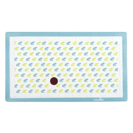 Tapis de bain BABYMOOV pour couvrir le fond de la baignoire et éviter les chutes de votre bout’chou. Antidérapant. Indicateur de température sur la coccinelle rouge (trop chaud). Très stable grâce à ses 10 grosses ventouses et 96 petites. Lavable. Dimensions : 70 x 40 cm. Décor : grenouille ou lilas.